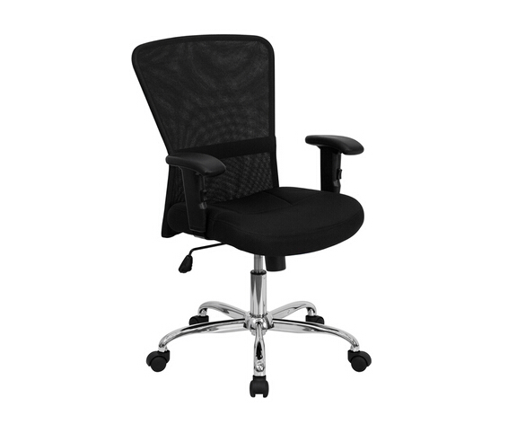 Black Mesh Office Computer Chair with Chrome Base and Height Adjustment Specification Thickly Padded, Mesh over Foam Seat Open Air Mesh Back Passive Lumbar Support Band on Curved Back for Increased Ergonomic Comfort Height Adjustable Nylon T-Arms Soft Polyurethane Padded Arm Rests Spring Tilt Control Mechanism Pneumatic Seat Height Adjustment Tilt Tension Control Chrome Finished Gas Lift Chrome Finished Base Dual Wheel Nylon Casters Dimensions Seat Size: 19''W x 19.25''D Back Size: 20.5''W x 20.5''H Seat Height: 18.25 - 21.75''H Arm Height From Floor: 25 - 31.75''H Arm Height From Seat: 6.75 - 9.5''H Overall Width: 24''W Overall Depth: 28''D Overall Height: 36.5 - 40''H